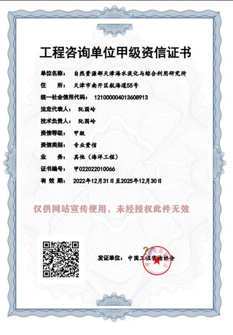 自然資源部天津海水淡化與綜合利用研究所1978年經國務院批準成立,隸屬于自然資源部,總部位于天津市南開區,公益二類事業單位,是我國唯一專門從事海水資源利用技術研究的科研機構。擁有300余人的科學研究、技術支撐和業務管理隊伍,3人享受國務院政府特殊津貼,1人入選國家級百千萬人才工程,40%以上人員具有高級職稱。在天津濱海新區設有中心北路分部,建有占地25萬平方米的示范基地,擁有50萬元及以上的大型科研儀器設備380余臺套,總價值4.37億元。