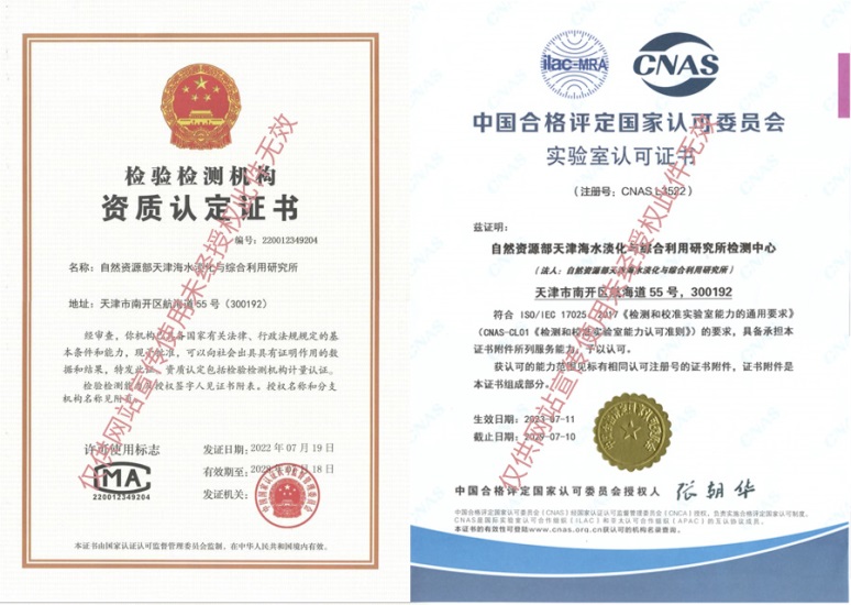 國家海水及苦咸水利用產品質量檢驗檢測中心成立于2007年6月,是國內唯一一家經國家質量監督檢驗檢疫總局、國家認證認可監督管理委員會批準的國家級海水利用產品質檢機構。本中心具有第三方公正地位的法定專業質量監督檢驗機構,是社會公益性的非營利事業單位。中心所有檢驗產品和參數均通過了實驗室 “三合一”評審,獲得國家認證認可委員會授權。