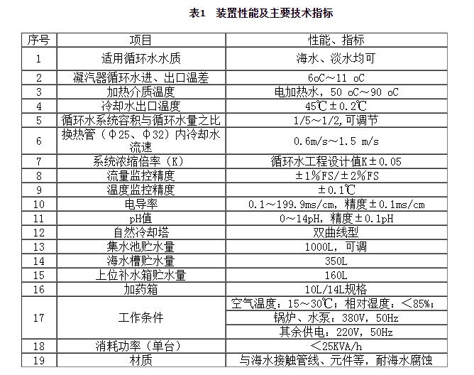 工作原理:在實驗室給定條件下,用電加熱水與凝汽器進行熱交換,模擬電力海水循環冷卻系統工程現場的流速、流態、水質、金屬材質、換熱強度和冷卻水進出口溫度等主要參數,以評定海水水處理劑的緩蝕、阻垢和殺生性能。