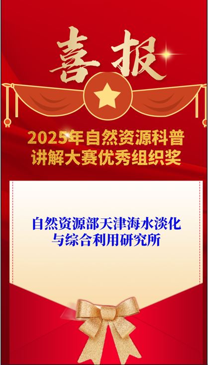 我所榮獲2025年自然資源科普講解大賽優秀組織獎!此次獲獎是對我所開展系列科普工作的肯定。下一步,我所將積極配合部科普工作辦公室,圍繞"提升全民科學素質 夯實科技強國基礎"主題,通過科普展覽、技術講座、實驗室開放日等形式,在自然資源全國科普月期間重點普及海水淡化知識,進一步提升公眾對海水淡化的認知,為科技強國建設貢獻科普力量。