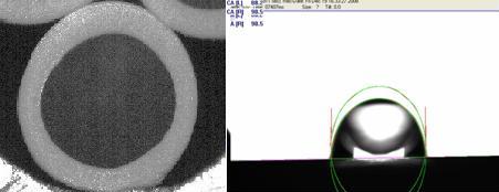 “膜法提溴用高性能疏水膜的研制與應用”項目是由膜技術研究室承擔的2007年所基本科研業務費團體項目,該項目自啟動以來,研究工作按照項目任務書要求逐步落實,提溴用疏水膜的研發工作取得階段性成果。提溴用疏水PVDF中空纖維膜斷面結構和接觸角如下圖所示,可以看出膜斷面多為海綿狀孔結構,接觸角為90.5°,具備較強的疏水性能。膜性能測試結果表明,膜N2氣通量最高可達到8.62 m3·m-2·h-1·0.01MPa,斷裂強度最高可達到6.06MPa,實現提溴效率>83%,上述性能參數均達到項目任務書中指標要求,可用于膜法提溴技術的應用,但應用過程中膜材料性能穩定性還有待進一步考察。該項目的實驗研究工作已基本完成,現進入結題階段。
