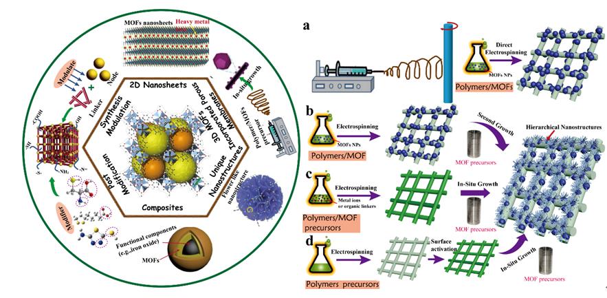 近期,淡化室研究人員就MOFs在重金屬離子去除領域的研究進展進行了廣泛的調研,對基于MOFs的多種不同材料的設計和性能應用進行了研究,尤其對MOFs與靜電紡絲納米纖維膜的結合方面進行了探討,并與天津工業大學劉倩副教授、日本九州大學Rasel Das博士合作,以“Metal Organic Framework (MOF)-Based Micro/Nanoscaled Materials for Heavy Metal Ions Removal: The Cutting-Edge Study on Designs, Synthesis, and Applications”為題撰寫評述性文章,發表在2021年1月的《Coordination Chemistry Review》期刊(2021,427C, 213554),《Coordination Chemistry Reviews》是由Elsevier出版的學術期刊,是目前化學學科最具權威性的綜述性學術期刊之一(JCR化學一區,2019年最新影響因子15.367)。