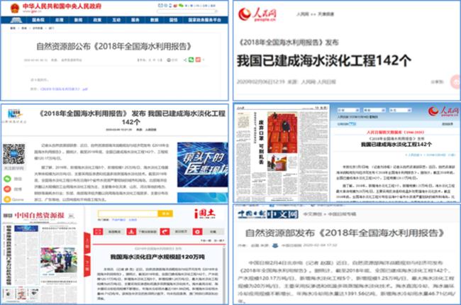 《2018年全國海水利用報告》系統總結分析了我國海水淡化、海水直接利用、海水化學資源利用以及檢驗與標準、政策與交流等方面的最新進展情況,從工程規模、區域分布、技術應用等角度對海水利用產業進行了詳細闡述。該報告的發布,將為政府部門決策和科研院所、企事業單位及社會公眾了解行業動態提供數據信息支撐,具有十分重要的意義?!?018年全國海水利用報告》現已被中央人民政府網站、人民網、新華網、人民日報、中國日報、中國自然資源報等多家報紙和網站報道或轉載。