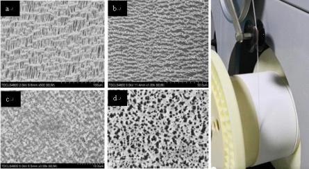 經過一系列技術難點的突破,我所聚四氟乙烯(PTFE)中空纖維膜研發工作取得階段性成果??茖W層面,形成了膜微孔結構形態和孔徑的調控原理和方法,可實現四種微孔結構中空纖維膜的制備(見下圖1);技術層面,實現了不同內外徑規格中空纖維膜的連續制備(見下圖2),如外徑1.5mm、1.3mm和1.0mm。值得關注的是,所調控的類海綿結構的PTFE中空纖維膜(如圖1-d),其微孔形貌特征明顯區別于傳統“微纖”、“節點”結構(如圖1-a),徑向抗撕裂強度顯著增加,能夠實現內壓式高壓力操作方式。