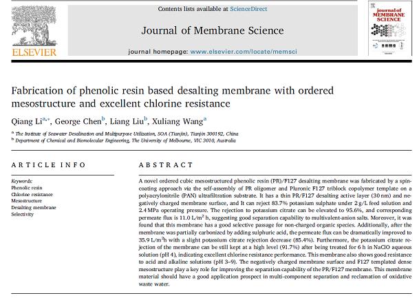 近日,我所聯合墨爾本大學共同開發了一種具有有序介觀結構(mesostructure)的酚醛樹脂基新型高分子脫鹽膜材料。該膜材料借助于旋涂技術以丙烯腈超濾膜為基底,通過酚醛樹脂低聚物與F127模板劑自組裝獲得,小角XRD表明它具有立方相介觀結構,對檸檬酸鉀的脫鹽率達到95.6%而對中性蔗糖分子具有很高的透過性,說明該膜對鹽和中性分子具有良好的選擇性。另外,該膜材料在pH4的次氯酸鈉溶液中處理6小時后脫鹽率仍保持較高的水平,說明具有很好的耐氯性。