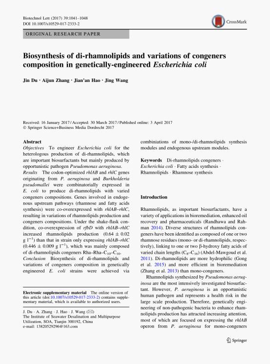 海水凈化與水再利用技術研究室杜瑾等在產鼠李糖脂基因工程菌的合成生物學構建及優化調控方面取得重要進展,其研究結果近期發表在Biotechnology Letters上。