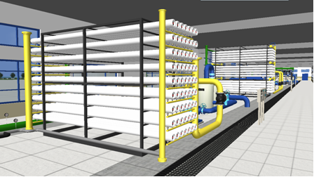 為加強海水淡化宣傳,推廣海水淡化技術,同時也為“海水淡化(反滲透系統)操作員”新職業培訓奠定基礎,海水淡化技術研究室承擔了面向反滲透海水淡化的全數字模擬仿真系統研制工作。該系統的研制借鑒低溫多效仿真平臺研發經驗,根據萬噸級反滲透工程的實體設備、過程機理、操作原則建立過程動態仿真模型,包括取水、預處理、超濾、反滲透脫鹽、產品水輸送及輔助加藥等全流程。并通過構建沉浸式虛擬環境和分布式仿真架構,實現“過程工藝模型+DCS控制仿真+三維現場操作場景”的無縫集成和實時交互,具備示范演示和虛擬教學功能。