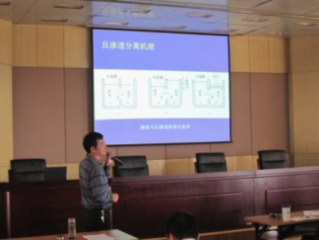 此次講座,潘主任介紹膜的分類及各自特點,并以目前應用較普遍的壓力驅動膜為重點,詳細講解了微濾膜、超濾膜、納濾膜和反滲透膜的分離原理及應用;針對膜制備工藝這個當前研究熱點,介紹相轉化制膜工藝中的NIPS和TIPS兩種制備方法原理、影響因素及各自的優缺點,指出能制備出網狀結構膜的TIPS法是目前膜制備技術發展的方向;結合工作經歷,潘主任還為大家講解了“天津市1000噸/天反滲透海水淡化示范工程項目”和“黃島電廠3000噸/天反滲透海水淡化工程”兩個典型膜法海水淡化工程案例;最后,結合目前我國的膜技術標準現狀的講解,指出雖然我國膜技術標準發展取得了相當成果,但標準仍然滯后于行業發展,標準的數量和質量還不能滿足需要,現有膜技術標準中涉及的性能參數主要為分離透過性能指標,膜物理和化學性能指標的相關標準有待建立,鑒于目前膜技術標準亟待完善的現狀及需要解決的重點問題,提出了膜技術標準研究的方向。