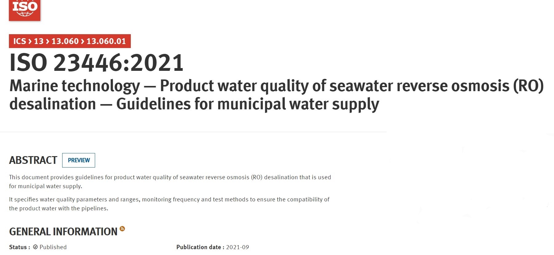2021年9月29日,國際標準化組織(ISO)發布《海洋技術-反滲透海水淡化產品水水質-市政供水指南》(ISO 23446:2021《Marine technology-Product water quality of seawater reverse osmosis (RO) desalination-Guidelines for municipal water supply》),這是由我國主持制定的首項ISO海水淡化領域國際標準,標志著中國海水淡化標準國際化工作取得新突破。