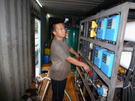 海水淡化技術研究室與咨詢中心聯合成立了項目組,開展了相關實驗研究工作。在我所研制的移動式反滲透海水淡化裝置的基礎上,開發了能夠模擬風能供能特點的控制系統,并將該裝置安放在天津港煤碼頭進行實驗研究。實驗期間項目組克服了煤碼頭港池海水含煤量大、水質差、交通不便利、環境惡劣等諸多困難,完成了模擬風能高峰、低谷時反滲透淡化裝置的運行狀態實驗,以及不穩定供能條件下,反滲透淡化裝置的能耗、產水水質、回收率、運行壓力等相關參數的研究,同時也開展了淡化裝置的自適應運行策略及控制方法的研究。項目的完成,為我所在非并網風能海水淡化耦合技術方面形成了一定的技術儲備。