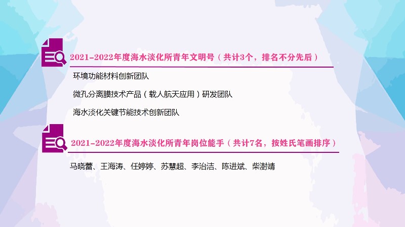 通過選樹先進典型,所黨委號召廣大青年職工把青春播撒在海水資源利用事業發展的新征程上,把成績鐫刻在邁向第二個百年的新時代里,切實成長為肩負海水資源利用國家隊時代擔當的主力軍和生力軍,讓行動成為青春最有效的磨礪,讓奮斗成為青春最亮麗的底色。