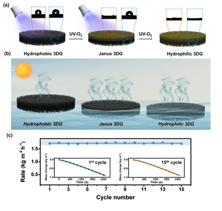 圖. (a)Janus結構三維石墨烯材料制備示意圖。(b)材料蒸發過程示意圖。(c)材料循環性能。