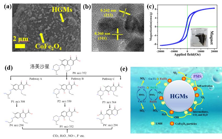 鹽酸洛美沙星(LMH)是一種廣泛應用于抗感染的氟喹諾酮類抗生素。作為一種新興污染物,由于存在相對穩定的喹諾酮環,其化學性質穩定不易自然分解,當進入水環境將對生態系統構成潛在威脅。近年,基于磁性CoFe2O4活化過硫酸鹽(PMS)產生高活性氧化物種的環境催化技術得到了持續關注和廣泛研究。然而,CoFe2O4活化PMS過程產生的大量H+腐蝕CoFe2O4晶格結構導致鈷和鐵離子溶出,降低催化活性并帶來重金屬污染風險。另一方面,粉末態CoFe2O4因其表面能較高,在合成過程中不可避免地出現團聚效應,且催化反應后固液磁分離過程依然無法解決催化劑組分流失難題。因此,降低催化過程CoFe2O4金屬離子溶出,改善CoFe2O4回收便利性,避免團聚失活等關鍵科學與技術問題的協同解決是CoFe2O4基非均相芬頓催化劑走向大規模應用的關鍵。