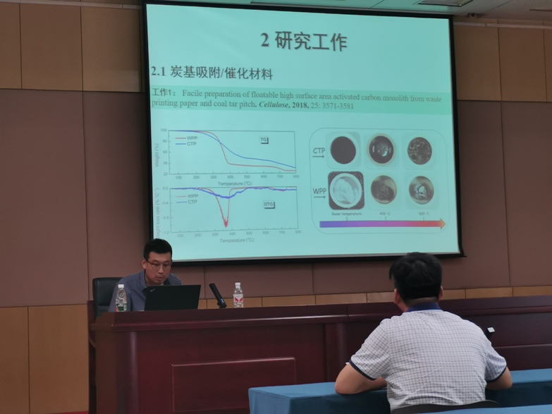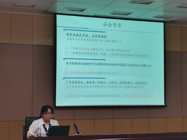 馬宇輝博士結合自身的研究方向從碳基吸附、催化材料及近期研究等幾個方面做了“生物質基多孔炭材料的研發及其水處理領域的應用”報告。楊揚博士從行業背景、核心技術、技術應用3個方面做了“界面光熱轉換海水淡化膜技術”報告。