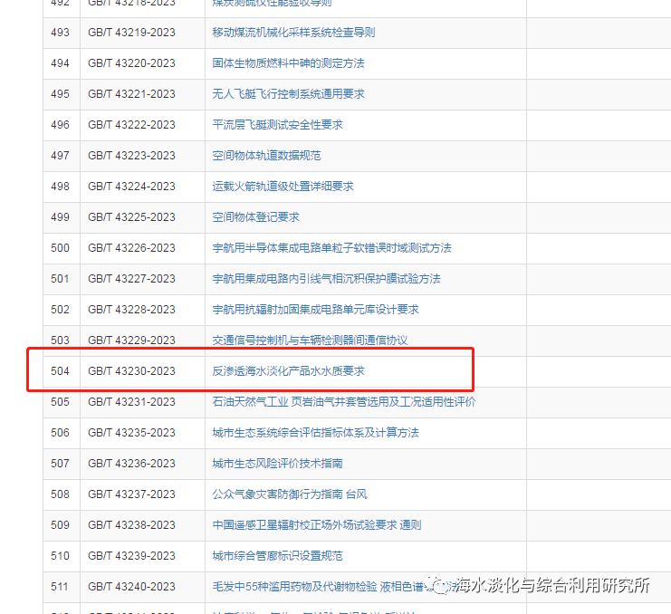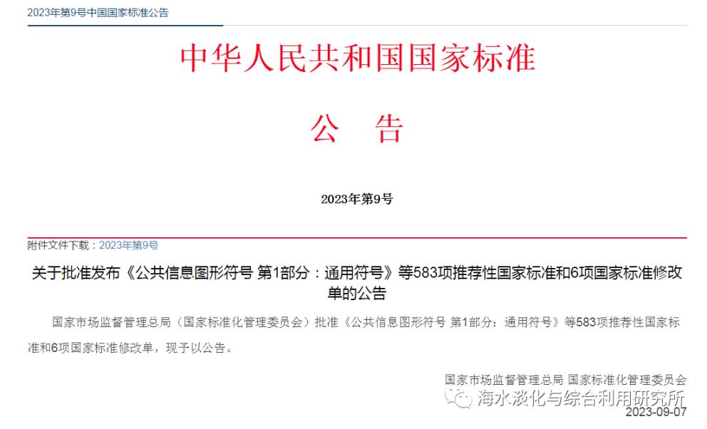 由我所負責起草的推薦性國家標準《反滲透海水淡化產品水水質要求》獲國家市場監督管理總局 國家標準化管理委員會批準(中華人民共和國國家標準公告2023年第9號)于2023年9月7日發布,標準號:GB/T 43230-2023,該標準將于2024年4月1日正式實施。