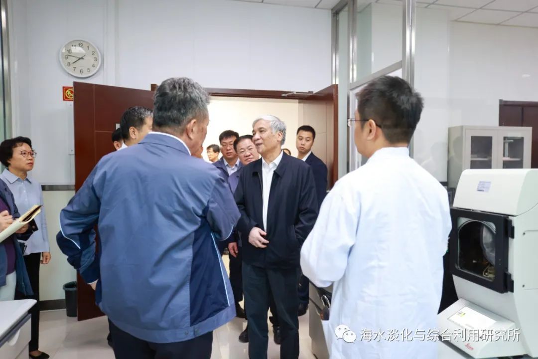 丁仲禮參觀了科技成果展室、納米顯微CT、膜材料微觀結構分析和特種分離膜制備實驗室,仔細聽取了阮國嶺所長關于大力發展海水淡化,助力經濟高質量發展的專題匯報,詳細詢問了海水淡化技術現狀、國內外市場需求和噸水成本以及膜技術研發與應用情況。