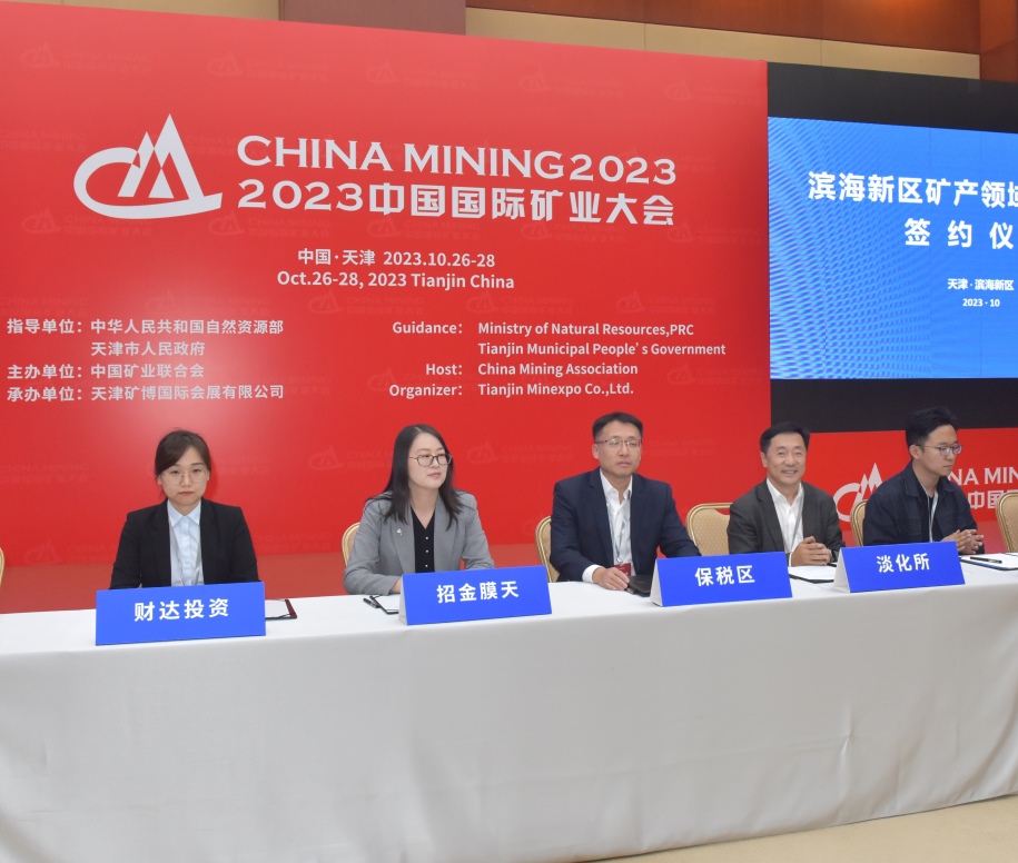 2023年10月26日, 在第二十五屆中國國際礦業大會期間,自然資源部天津海水淡化與綜合利用研究所(以下簡稱淡化所)與天津港保稅區、山東招金膜天股份有限公司舉行戰略合作協議簽署儀式。淡化所副所長張秋豐、招金膜天副總經理楊光煒和保稅區相關領導出席儀式并分別代表三方簽署了戰略合作協議。