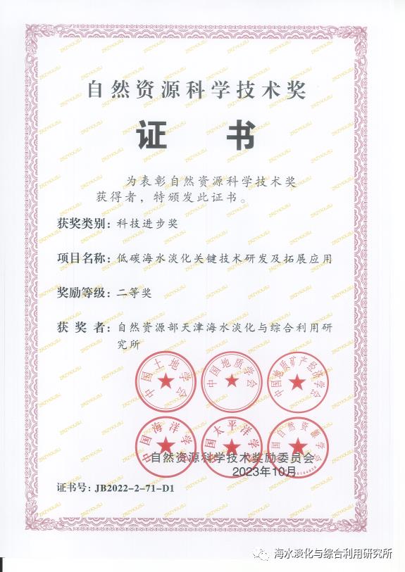 近日,自然資源部公布了2022年度自然資源科學技術獎獲獎成果,自然資源部天津海水淡化與綜合利用研究所、沃頓科技股份有限公司、首鋼京唐鋼鐵聯合有限公司聯合申報的“低碳海水淡化關鍵技術研發及拓展應用”獲得自然資源科技進步二等獎。該成果針對制約海水淡化產業發展的節能工藝、低品位余熱高效利用、反滲透膜材料、多元耦合供能等主要技術難題,歷時10余年的持續研發,攻克了影響海水淡化能耗和工業企業余熱浪費的堵點和痛點,形成自主原創的低碳海水淡化工藝、技術、材料和裝備體系。相關技術和產品已在國內外鋼鐵、電力、冶金、化工、印染等多個領域得到成功應用,出口至印尼、馬爾代夫等,國內大連、浙江舟山、江蘇、海南等應用項目達數十個。2018-2021年建成廢熱水耦合蒸餾海水淡化工程總規模37.5萬噸/日,占全國蒸餾海水淡化的60%;開發的超濾膜、納濾膜、高壓和超高壓反滲透膜產品,服務全球水處理工程總量超過2000萬噸/日,創造的直接經濟效益超過30億元,間接經濟效益超100億元。項目構建的低碳海水淡化成套技術裝備體系,樹立了行業典范,支撐我國海水淡化技術向綠色低碳轉型發展,對保障沿海地區水安全和助力實現“雙碳”目標具有積極作用,環境效益空間巨大。