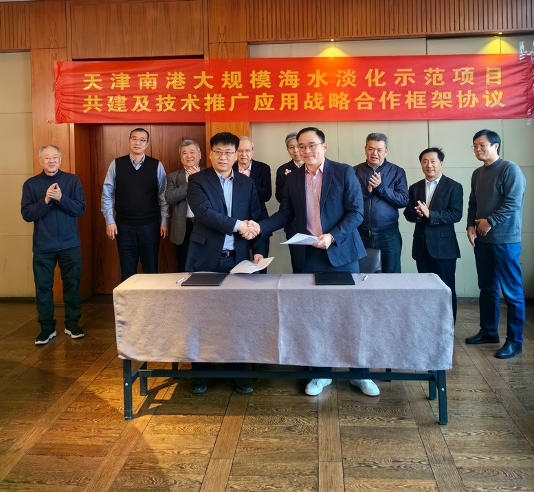 海水淡化是天津南港工業區工業用水的主水源,將為園區經濟高質量發展提供重要支撐。為大力推進天津南港工業區海水淡化及綜合利用一體化(30萬噸示范)項目,共同開發新技術、拓展新領域,先達(天津)海水資源開發有限公司和自然資源部天津海水淡化與綜合利用研究所于2024年1月31日簽署了《天津南港大規模海水淡化示范項目共建及技術推廣戰略合作框架協議》。先達公司執行董事馬崇維和我所初喜章副所長代表雙方簽署了協議,天津市經濟開發區管委會馬建軍副主任、先達公司董事長馬守中、董事蔡衛、CEO楊宏飛以及我所阮國嶺所長、張秋豐副所長等見證簽約儀式。
