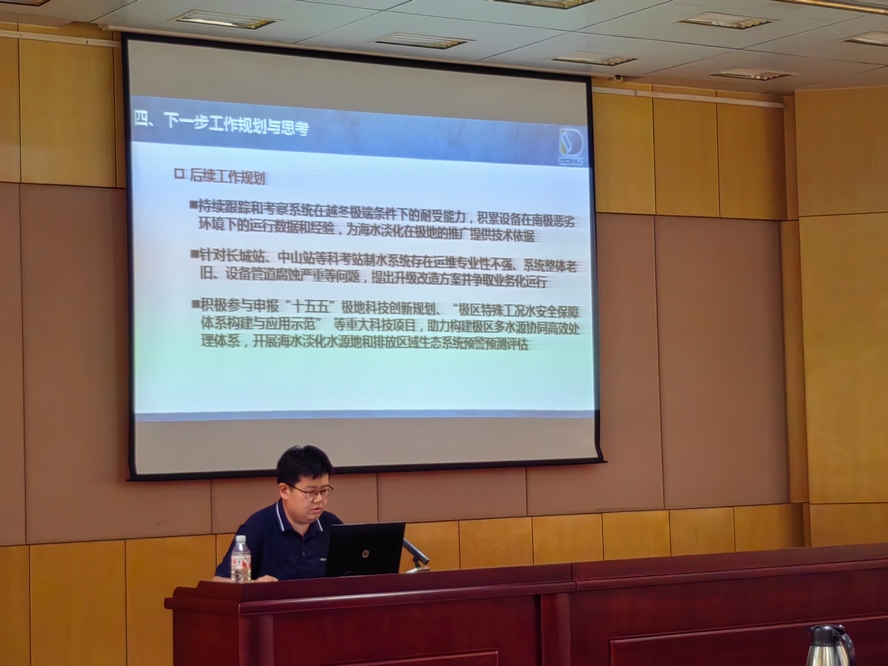 報告會上,馮濤同志系統介紹了項目的整體情況。從南極科考站的水源需求切入,闡述了秦嶺站建站背景及項目立項依據;詳細匯報了設備研發全過程,包括前期策劃、創新設計、加工制造、預驗收及運輸準備等關鍵環節;通過圖文并茂的形式,生動展示了歷時5個月、航程25000海里的南極考察實況,重點分析了極地特殊環境下遇到的技術挑戰及解決方案;針對極地低溫環境中設備工藝優化、智能控制系統改進等方向提出了建設性思考,并對后續工作規劃提出建議。