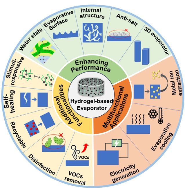太陽能驅動界面水蒸發(ISSG)技術作為一種利用綠色能源可持續生產淡水的方案,在緩解全球水資源短缺問題上展現出巨大潛力。其中,水凝膠因其固有的親水性和功能可設計性,被視為構建ISSG蒸發器的理想基底材料,并推動了新一代多功能ISSG蒸發器的發展。淡化室團隊綜述了水凝膠基ISSG在蒸發性能提升策略、功能化修飾設計方面的研究進展,探討了其在新興領域的應用前景,并對未來發展中面臨的機遇與挑戰進行了總結與展望。
