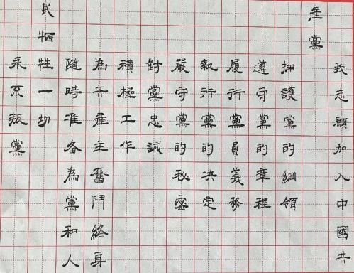 為引導廣大黨員增強黨性意識,銘記黨員身份,牢記入黨誓詞,還開展了手抄黨章詞硬筆書法比賽。每位黨員除抄寫入黨誓詞外,還自選了黨章其他內容,一幅幅用心抄寫的作品,有的蒼勁有力,有的雋秀挺拔,有的行云流水,一顆顆“忠黨之心”躍然紙上,進一步激發黨員學習黨章、遵守黨章的熱情。