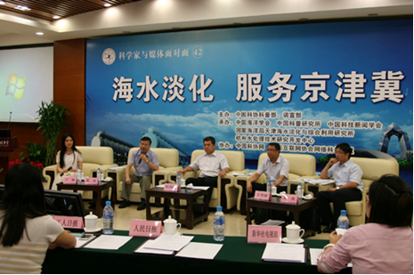 國家海洋局建局50周年紀念日——7月22日當天,我所阮國嶺總工程師受中國海洋學會邀請,參加在中國科技會堂舉辦的第42期“科學家與媒體面對面”活動。中國海洋學會常務副理事長兼秘書長雷波司長擔任專家主持。來自杭州水處理技術研究開發中心、中國膜工業協會等單位的專家和阮總一起,圍繞“海水淡化 服務京津冀”這一主題,從海水淡化的技術層面、應用層面和產業發展政策層面,通過與36家媒體互動,向公眾解讀海水淡化,普及海水淡化科學知識,針對公眾關心的淡化海水問題答疑解惑,消除大家的疑慮和擔心。