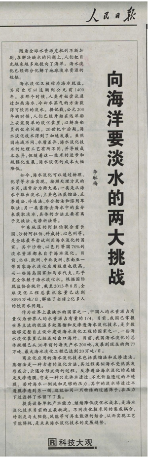 2014年05月08日,《人民日報》國際版【科技大觀】欄目刊發了李琳梅所長的署名文章《向海洋要淡水的兩大挑戰》。文章對海水淡化的主要方法、發展歷史和成本做了深入淺出地科普介紹,并概述了全球海水淡化技術和產業發展態勢、我國缺水形勢和海水淡化技術及產業現狀。最后,文章指出:提高設備單機產水能力、繼續降低淡化水成本,是海水淡化技術目前的主要挑戰。不同淡化技術間的集成耦合,特別是與太陽能、風能等可再生能源的結合,從而實現工藝節能降耗,是未來海水淡化技術的發展趨勢。該文刊發后,立刻被新華網、鳳凰財經、中國網、網易財經、新民網、星島環球網等主要媒體轉載,反響熱烈。