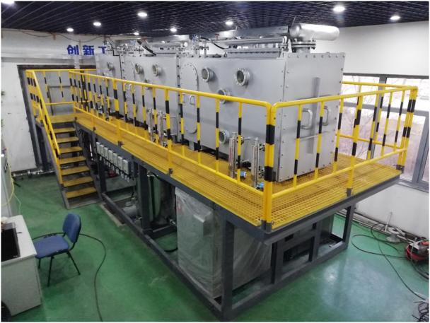 該測試平臺采用LT-MED低溫多效蒸餾技術,依據“實驗功能完備、運行穩定可靠、拆裝移動靈活”的原則設計和建造,主體設備由兩效水平管降膜蒸發器和水平管降膜冷凝器串聯構成;整體采用方形結構設計,“一”字形布置,裝填密度大,空間尺寸小,拆裝操作便捷,平臺總尺寸7840×3820×3600mm,總重量約7.5噸。