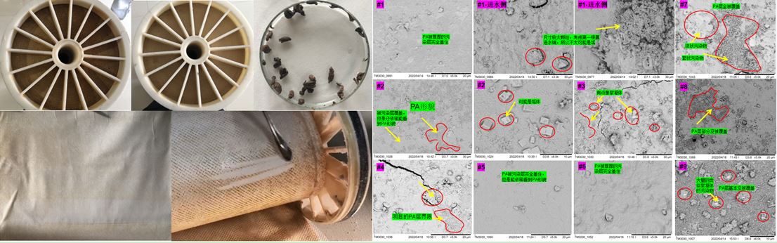 膜元件失效分析技術。通過膜元件物理性損傷分析、膜元件解剖、膜片化學結構完整性測試分析、膜表面沉積污染物賦存狀態和結構分析,結合項目工藝流程設計和服役運行情況,精準定位膜元件失效原因,提出涉及工藝改進、運行調節、清洗維護等的全方位綜合解決方案。