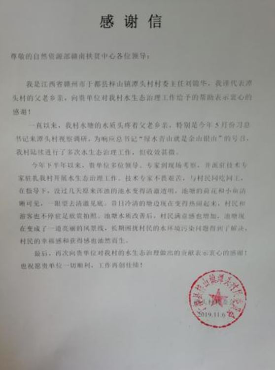 2019年9月,在自然資源部贛南扶貧中心的協調下,我所派駐技術人員駐扎潭頭村開展水生態治理工作。技術人員通過水樣檢測、分析和方案論證,最終采用我所攻關研發的高孔藻基凈水劑為主體并配合生態浮島等技術手段開展治理。經治理,池塘水質明顯改善,荷塘、小魚清晰可見,村民滿意感增加,池塘現在變成了一道亮麗的風景線,長期困擾村民的水環境污染問題得到了解決,村民的幸福感和獲得感油然而生。2019年11月6日于都縣潭頭村委會代表幫扶村民向我所送來感謝信。