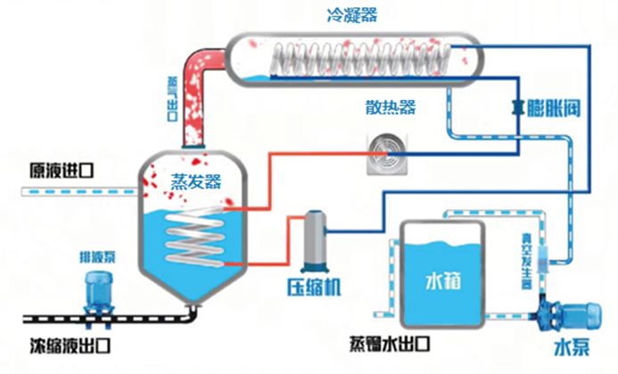 熱泵式蒸發器將料液在真空條件下加熱蒸發,通過壓縮機對冷媒進行絕熱壓縮,使工質升溫升壓為蒸發器持續提供熱量,同時利用冷凝器回收蒸汽潛熱,使二次蒸汽的熱量得以重復利用,確保以最低能耗進行料液蒸發,經濟效益顯著。