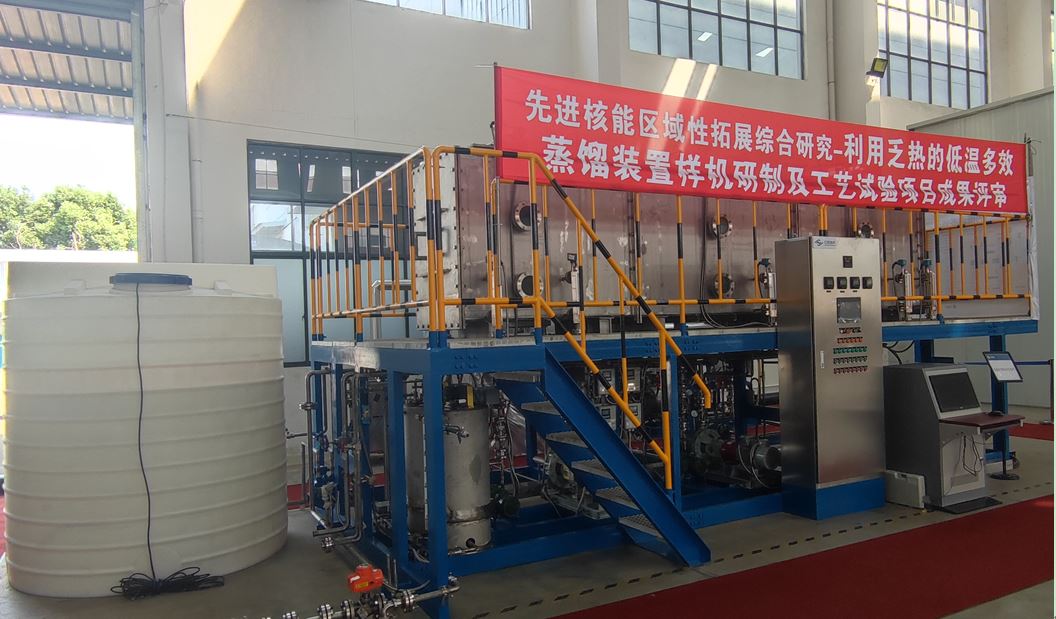 我所與江蘇金環科技有限公司、上海核工程研究設計院有限公司進行合作,開展了利用乏熱的低溫多效蒸餾裝置樣機研制及工藝試驗。該項目成功將低溫熱泵與多效海水淡化裝置相結合,利用熱泵將核電廠低品位乏熱或MED冷凝器排放的熱量回收并提升品位后作為蒸發器熱源,再通過多效蒸餾工藝進行海水淡化,實現了核能綜合利用和節能減排。以該項目為技術基礎,后續可推廣應用于核放射性廢液、易揮發料液、熱敏感物質的蒸發濃縮等不同領域。