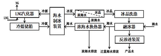 LNG冷能淡化是利用流體式氣化器提取LNG冷能,匹配海水冷凍溫度,采用核心流化床技術將海水冷凍成為具有流動性的冰漿,再對冰漿進行冰水分離的凈化過程。工藝流程簡圖如下:
