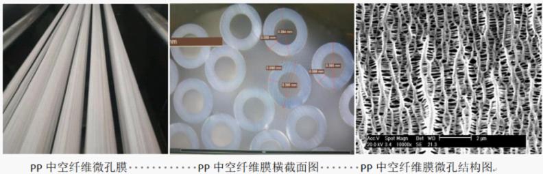 熔融擠出速冷固化耦合高速拉伸定向結晶技術制備高強度超細聚丙烯(PP)中空纖維,重結晶后拉伸制備外徑0.4mm中空纖維膜,孔隙率大于40%、平均孔徑100nm,產品性能與國際知名品牌(Liquid-cell)相當,滿足脫氣、膜吸收等膜接觸器場景應用。